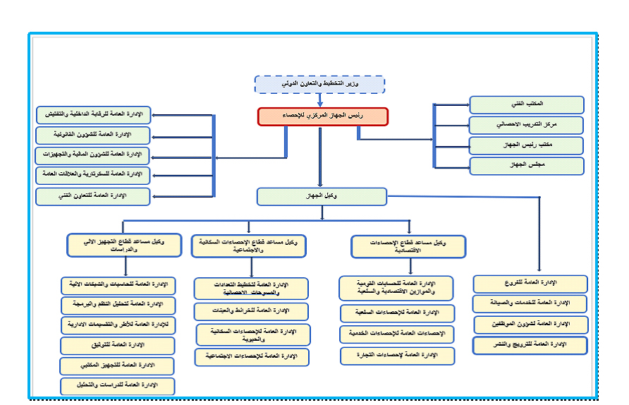 Central Statistical Organization operates in accordance with the Organizational structure approved by CSO regulations issued in 2003 and as it is shown in the figure on a temporary basis , with some necessary innovations that will be contained in the new organizational structure imposed by regional , Arab and International updates in functional directives and statistical work .